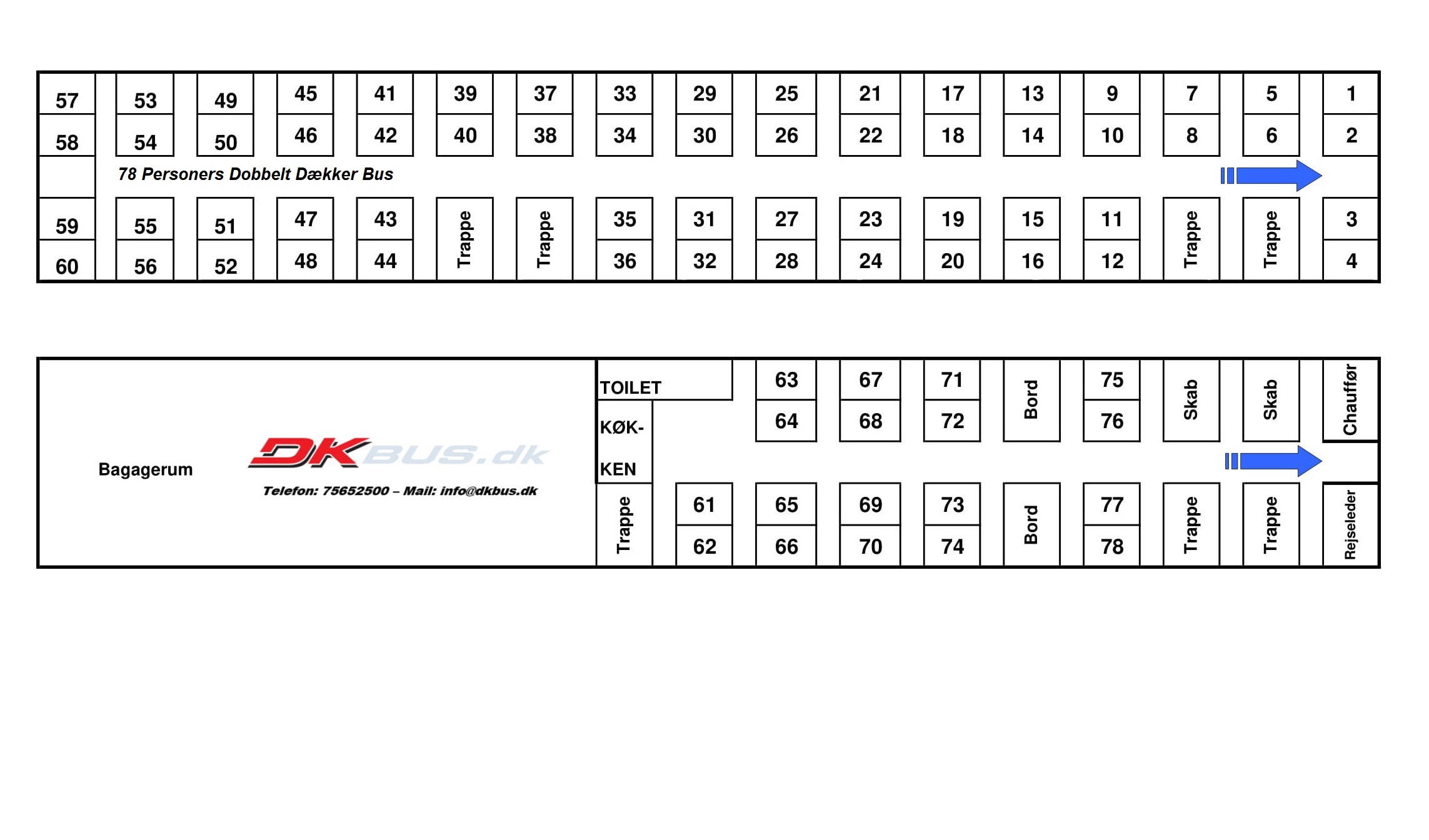 I vores dobbeltdækkerbus får I ikke kun god plads, men også god udsigt fra øverste dæk. Vores erfarne chauffører sørger for en behagelig rejse fra start til slut og fortæller gerne om de interessante steder, I passerer undervejs. Se indretning og siddeplan i vores dobbeltdækkerbus med plads til 78 passagerer.